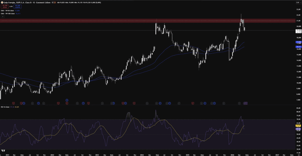 No gráfico semanal, a Galp conta uma história clara: tendência de alta desde 2021, com uma correção profunda em 2024 até aos €13 e uma recuperação explosiva em 2026 que levou o preço até máximos acima dos €22 , zona de resistência histórica marcada a vermelho que rejeitou o preço com força.
