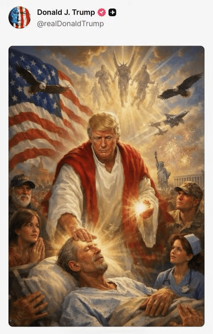 Na última segunda-feira, no meio de um bloqueio naval ao Estreito de Ormuz e de uma guerra com o Irão, Trump publicou no Truth Social uma imagem gerada por IA onde aparece vestido de branco e vermelho, com a mão na testa de um doente e luz a emanar da outra. O estilo? Arte religiosa clássica. O personagem? Jesus Cristo.